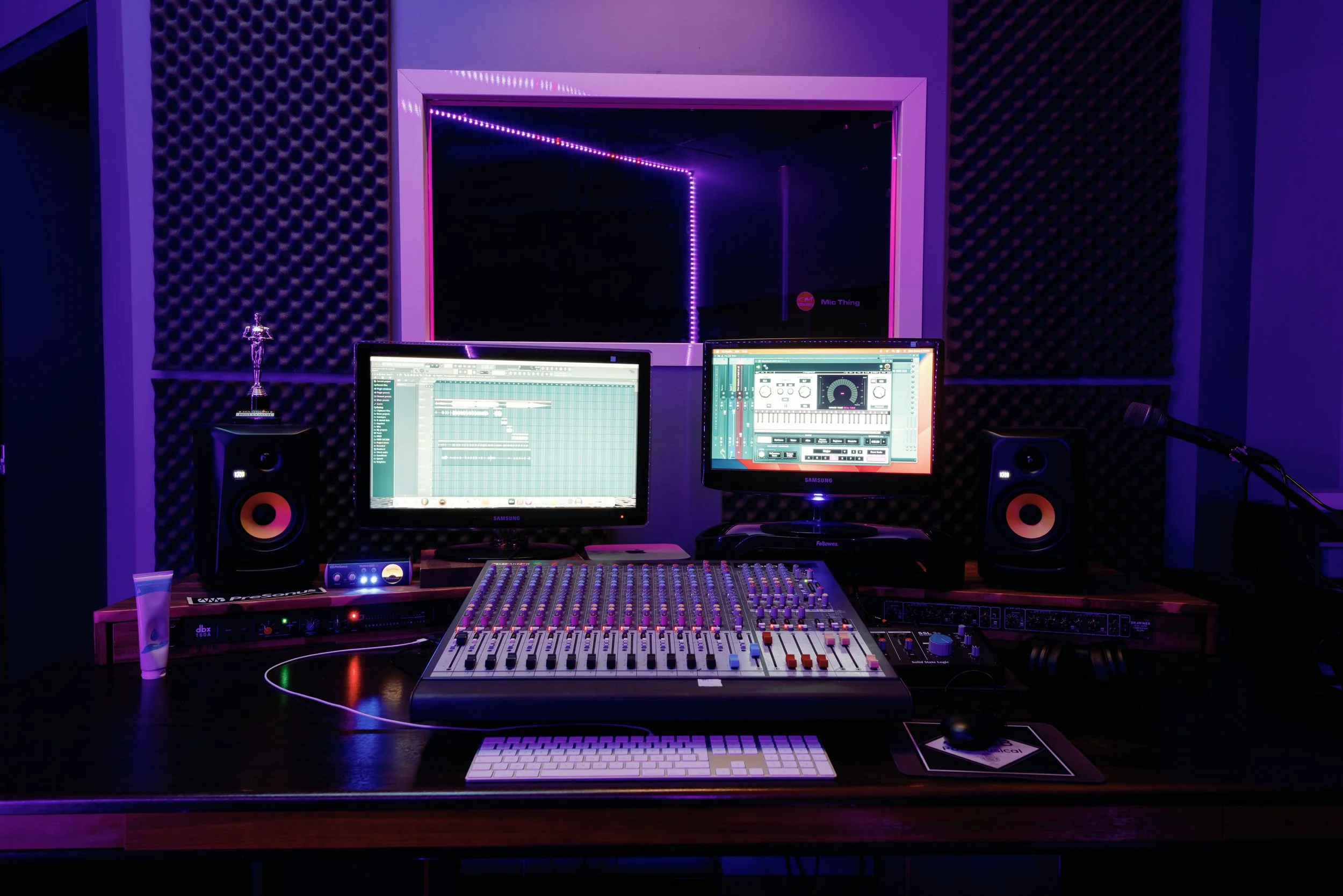La régie est équipée d’enceintes KRK ainsi qu’une table de mixage Allen & Heath. Un Mac Mini en Dual Screen relié à une carte son SSL2+ , et disposant de FL studio, Digital performer, et d’autres logiciels de séquenceur audio …